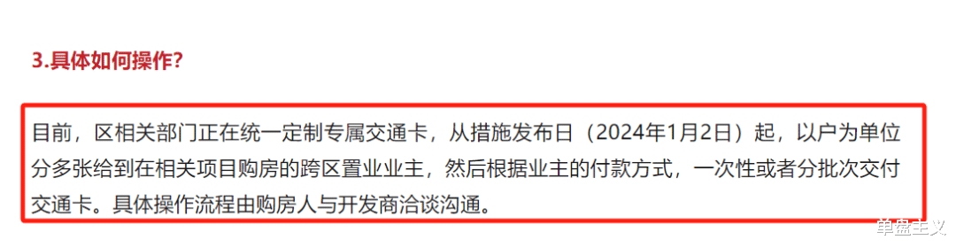 目前正在统一定制专属的交通卡,从1月2日起的跨区购房客户,一次性或者分批次交付交通卡