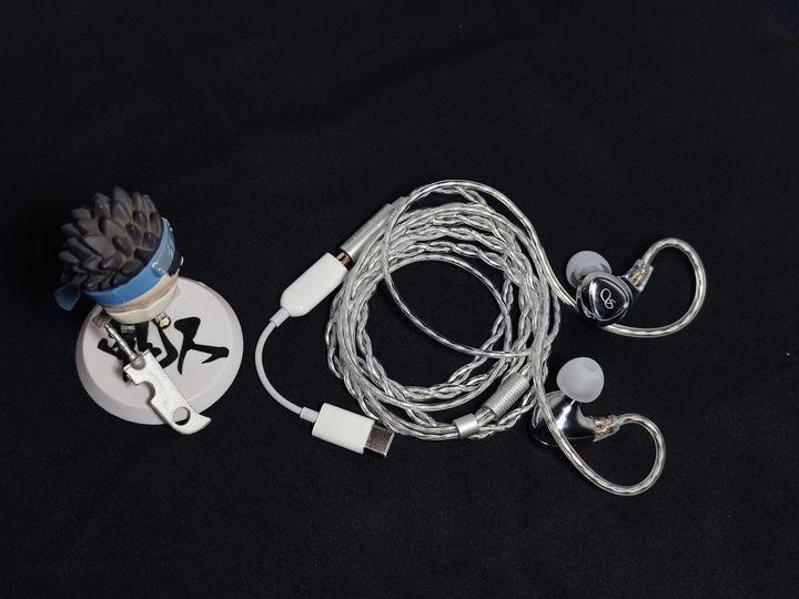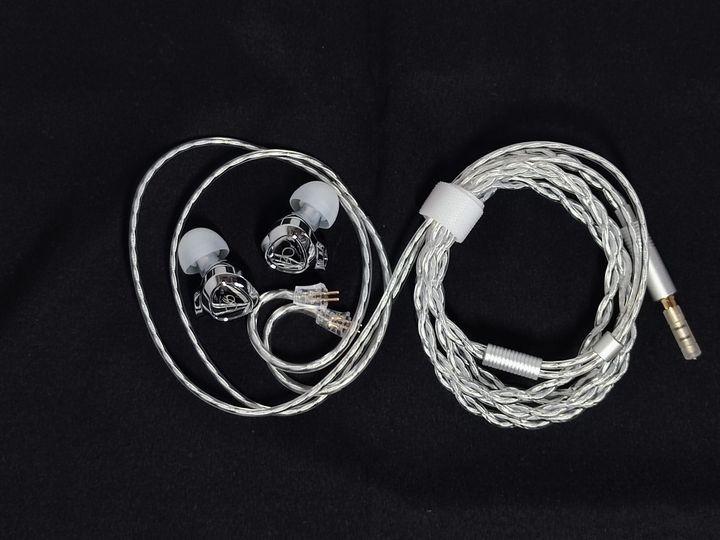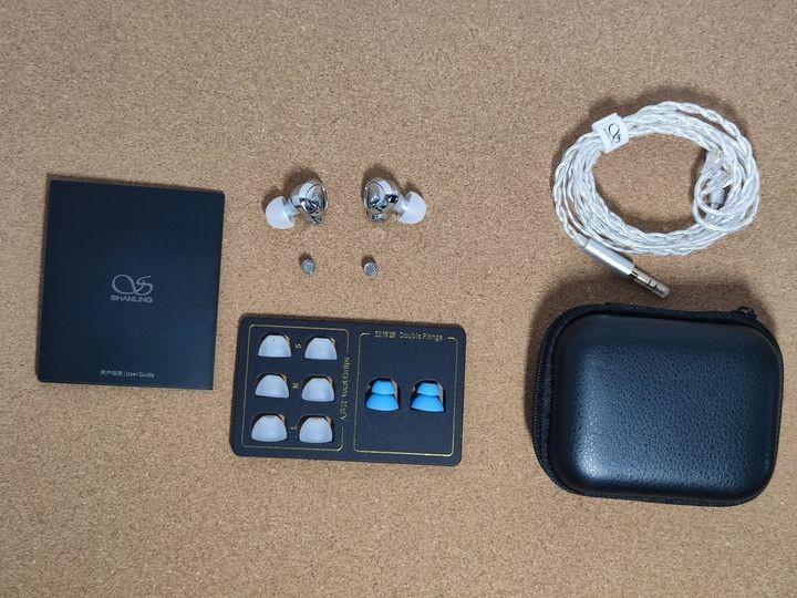 打开包装可以看到耳机本体的样貌及其配件,耳机本体、皮质耳机收纳包、人声套S/M/L码各一对、双节套一对、红色的替换调音导管,以及标配4股32芯单晶铜银线材。
