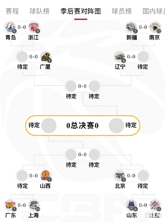 常规赛前四名(直接晋级八强)浙江广厦(39 胜 7 负,常规赛冠军)山西(34 胜 12 负)北京(32 胜 14 负)辽宁(32 胜 14 负,卫冕冠军,7 连胜收官)