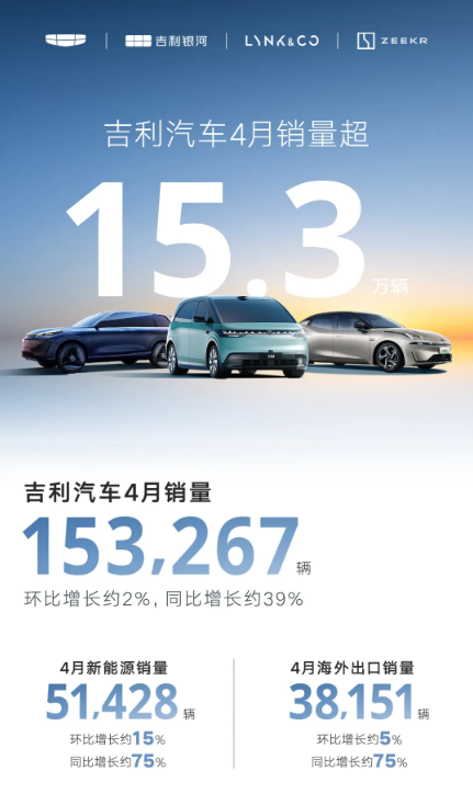 在车市普遍内卷的环境下,吉利汽车凭借卓越技术力与前瞻布局,于4月创下销量神话——单月销售超15万辆,其中新能源车销量激增75%,达到5万辆,展现出强劲的市场渗透力。