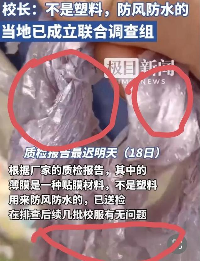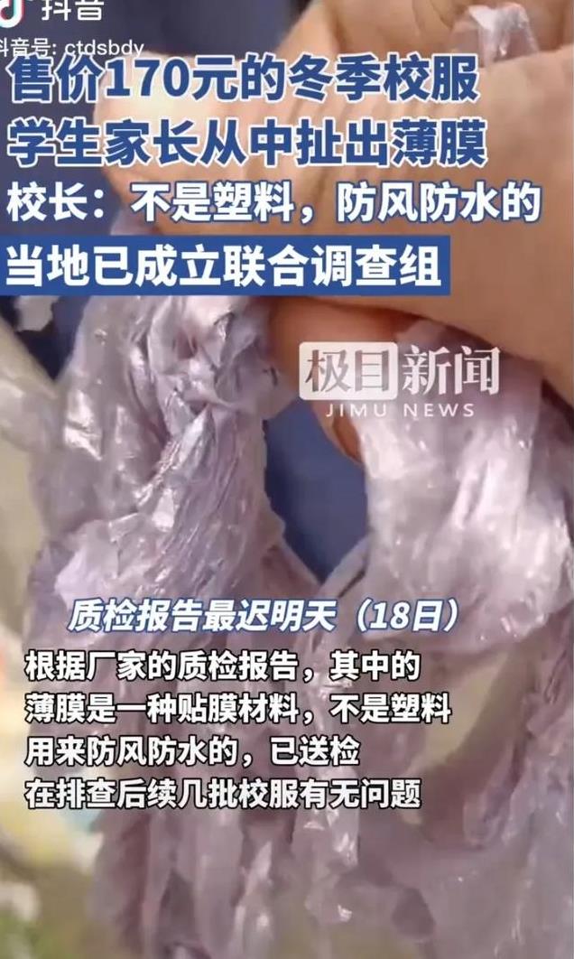 学校和生产商的回应,都说这校服没有质量问题,家长所谓的薄膜是防风防水材质。