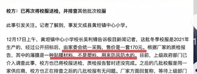 “校服是2021年生产的,公开招标,由家委会统一采购,售价170一套,薄膜是贴膜材料,用来防风防水,不是塑料。”