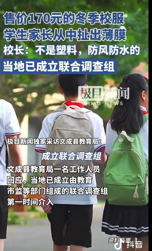 “会对涉及校服的各个环节进行调查通报,确保调查权威性,如果属于劣质材料,会严肃处理。”