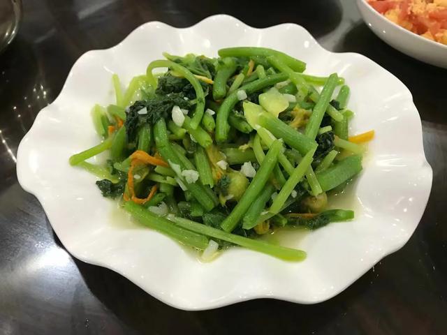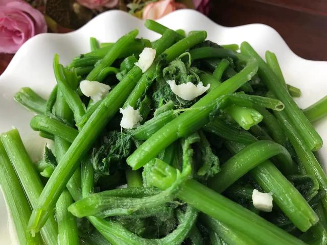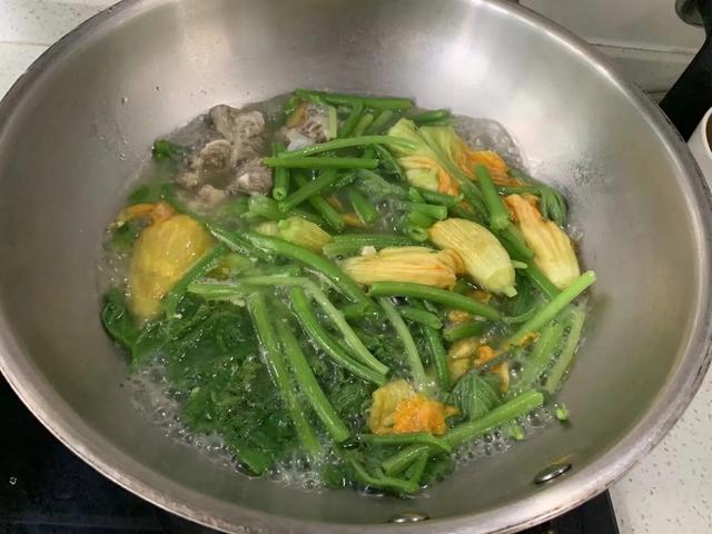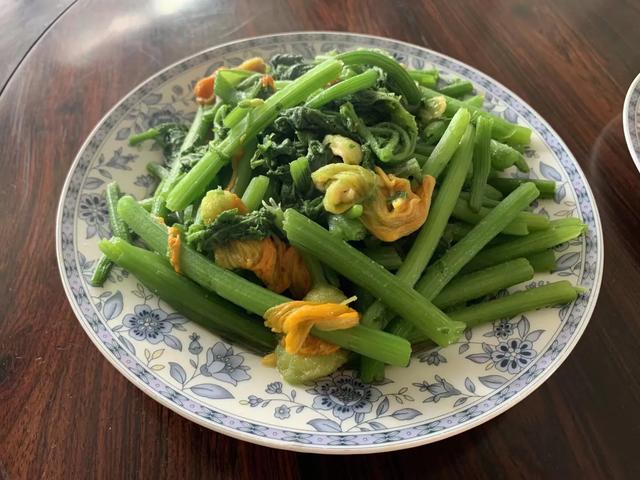 把皮剥掉,叶子搓一搓,蒜蓉炒,配上几朵南瓜花更好。