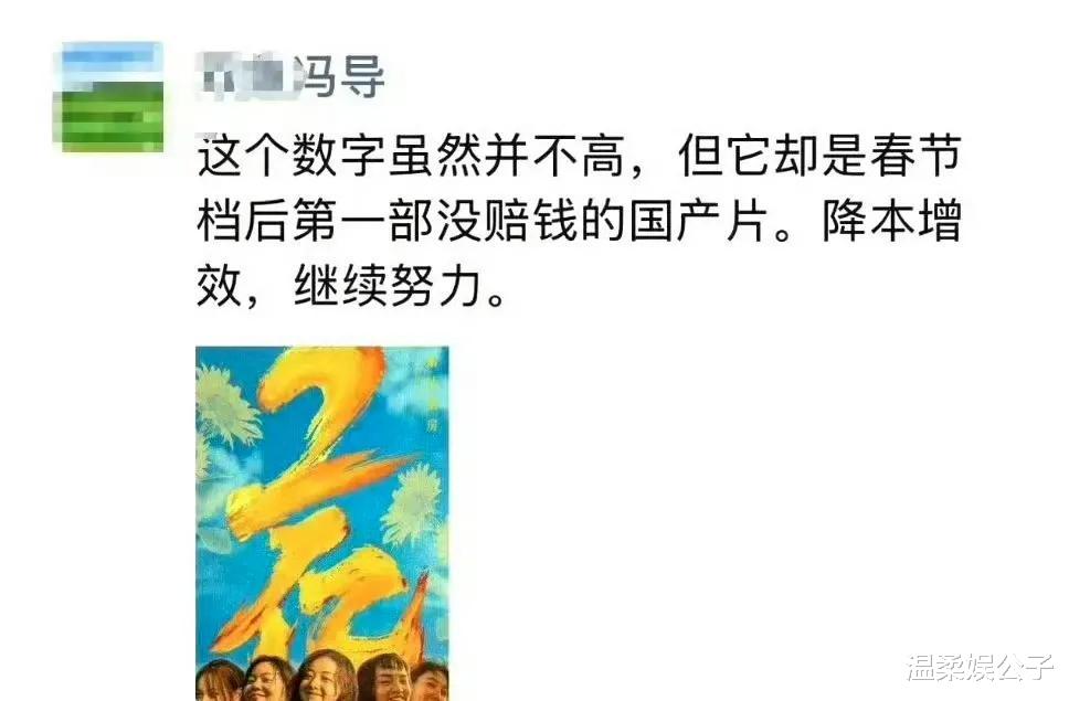 在影视寒冬之际,能有这样的成绩非常不错,以至于冯小刚在朋友圈感叹:数字虽然不高,但却是春节档后第一部没有赔钱的国产片,降本增效,继续努力。