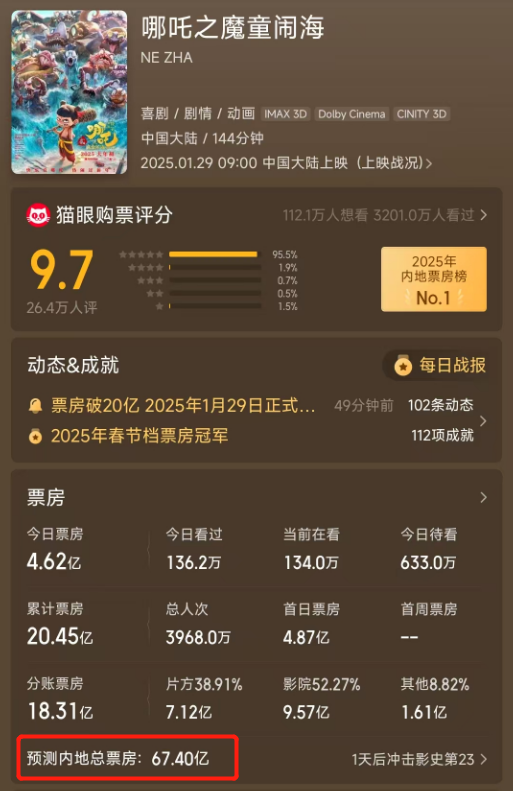 榜首毫无疑问是《哪吒2》的,上映4天票房已经超过了20亿大关,远远甩开其他大片,而且随着豆瓣评分进一步走高,不管排片还是票房占比都有所增加,其预测票房也已经攀升至67亿。