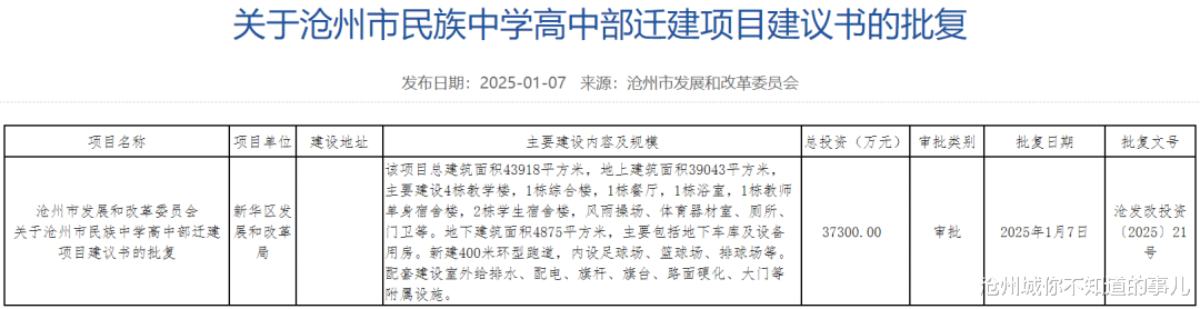 近日,沧州市发展和改革委员会官网发布《关于沧州市第二十一中学项目建议书的批复》《关于沧州市友谊路小学项目建议书的批复》《关于沧州市民族中学高中部迁建项目建议书的批复》,三所新建、迁建学校总投资7.103亿元。具体来看↓↓↓