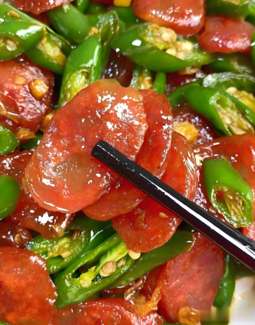 (2) 火候控制:炒腊肠时要保持中小火,避免腊肠炒焦。青椒的炒制时间不宜过长,以保持青椒的脆嫩口感。