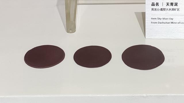 来看看宜兴紫砂博物馆的原矿天青泥。这块天青泥,从色泽上看,和其它紫泥矿料颜色相近,但又多了一层青色。再看看试片与紫泥的试片颜色也相差无几。