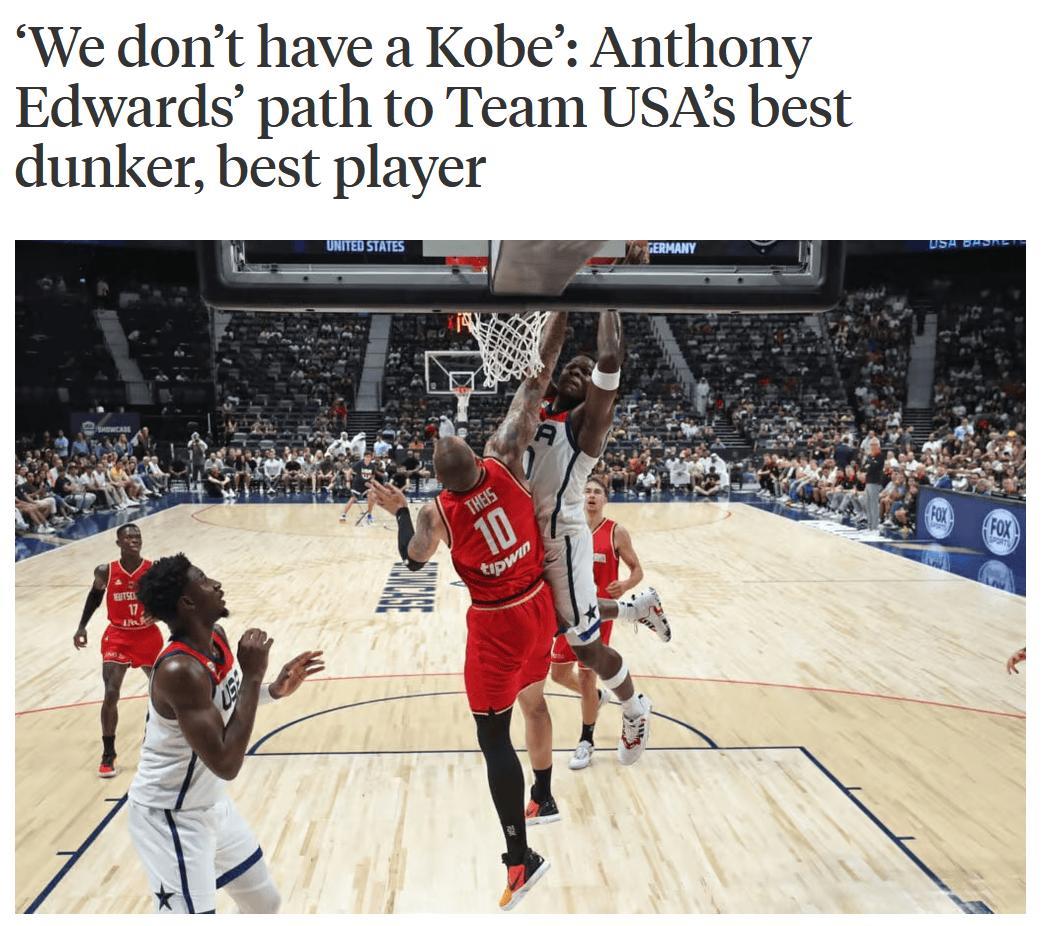 北京时间8月25日,男篮世界杯将于今天正式开战。在今天早些时候,著名媒体The Athletic撰文报道了爱德华兹成为美国队首发一事,起初他被放在替补阵容中,他对此颇有微词,但他用表现赢得了一个主力位置。