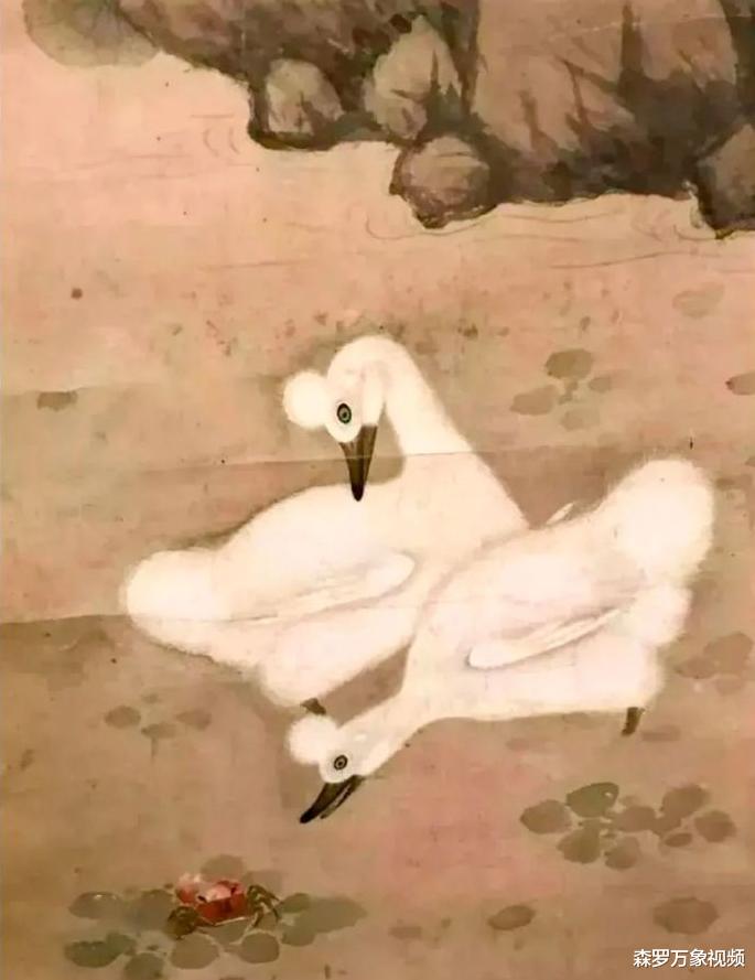 它们悠游于荷塘之中,一只正低头梳理羽毛,另一只则目不转睛地盯着旁边的小螃蟹,画面生动有趣,也为我们了解当时的凤头白鸭提供了珍贵的图像资料。