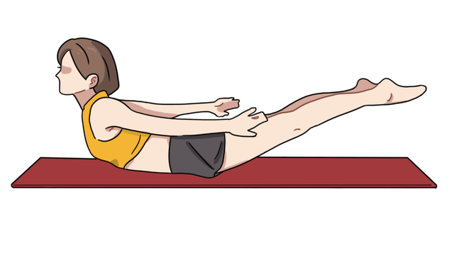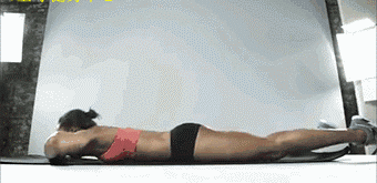 3.让腹部着地,抬起时身体呈反弓形,保持5-10秒,还原放松。