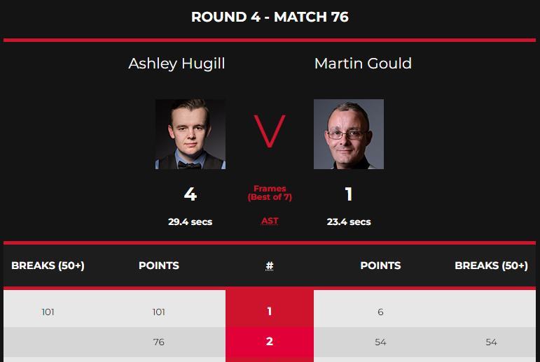 古尔德迎战赫吉尔,首局赫吉尔单杆101分拿下,第二局,古尔德打出了单杆54分,赫吉尔以76-54拿下第二局,第三局赫吉尔单杆65分,以65-17拿下,赫吉尔3比0拿到了赛点;古尔德第四局单杆53分,以108-8追回一局;第五局,赫吉尔单杆64分,以71-14拿下。