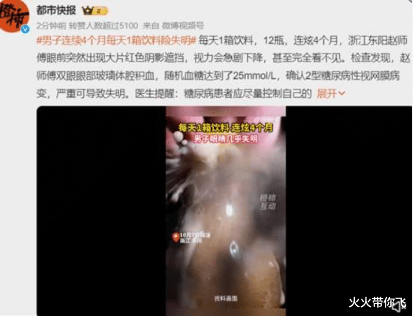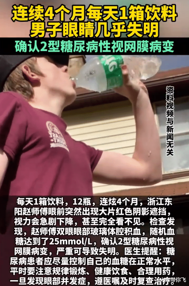 事情发生在浙江东阳,赵师傅是个爱喝饮料的主儿,但是呢,他这一爱就有点儿过头了,连续4个月,每天雷打不动地喝掉一整箱饮料!这可不是小数目啊,咱们想想都觉得肚子胀得慌,结果,有一天赵师傅突然发现,自己眼前出现了大片红色的飞蚊样东西,视力也急剧下降,几乎看不清东西了,这可把他吓得不轻,赶紧跑到医院去检查。