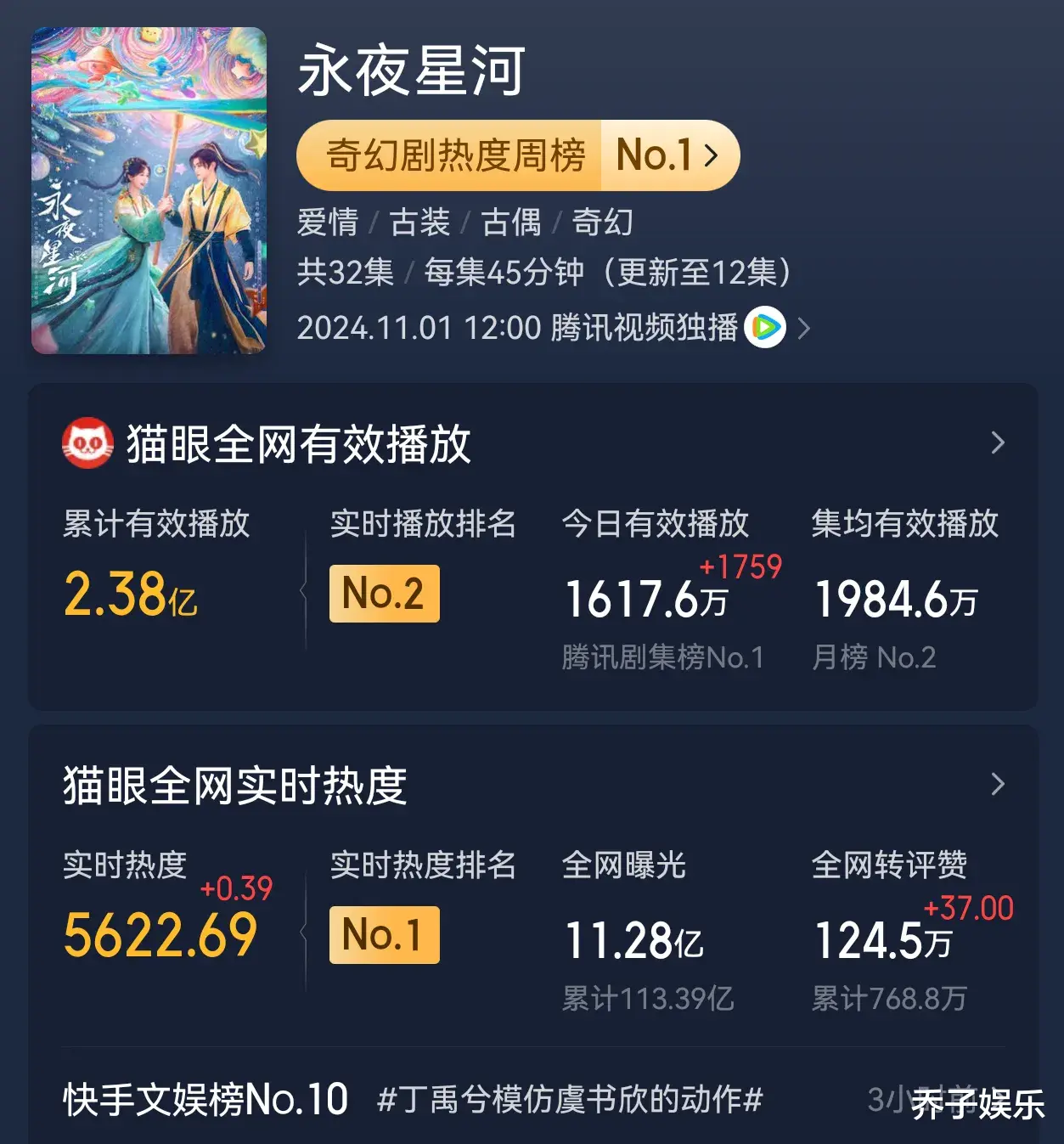 由赵一龙执导,虞书欣、丁禹兮、祝绪丹,杨仕泽领衔主演,陈都灵、钟欣潼、徐海乔等特别主演的《永夜星河》热度与讨论度持续走高,全网热度实时排名保持在前二,累计播放量已达2.38亿...