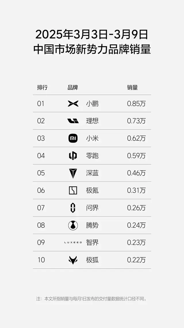 在最近的这一周(3月3日—3月9日)中,理想仍未能扭转局势,周销量0.73万辆,仍然低于小鹏的0.85万辆。
