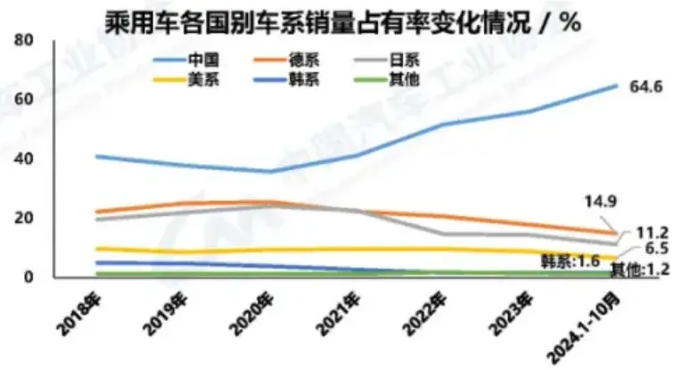 过去5年间,合资汽车在中国市场经历了从巅峰到低谷的剧烈波动。根据中汽协数据,2019年跨国品牌乘用车市场份额达到70.8%,与之相比,自主品牌市场份额为39.2%;仅仅5年后,2024年10月,跨国品牌与自主品牌市场份额分别为35.4%和64.6%。