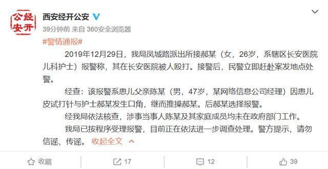 华商报此前报道,2019年12月29日下午3时许,一名30多岁的男子带着孩子去长安医院急诊看病,想插队,被护士郝女士拒绝。随后,轮到他的孩子做皮试时,孩子哭了。男子认为郝女士在报复,殴打了郝女士后导致她出现短暂晕厥,被送往抢救室抢救。在此期间,涉事男子自称是市政府的领导。