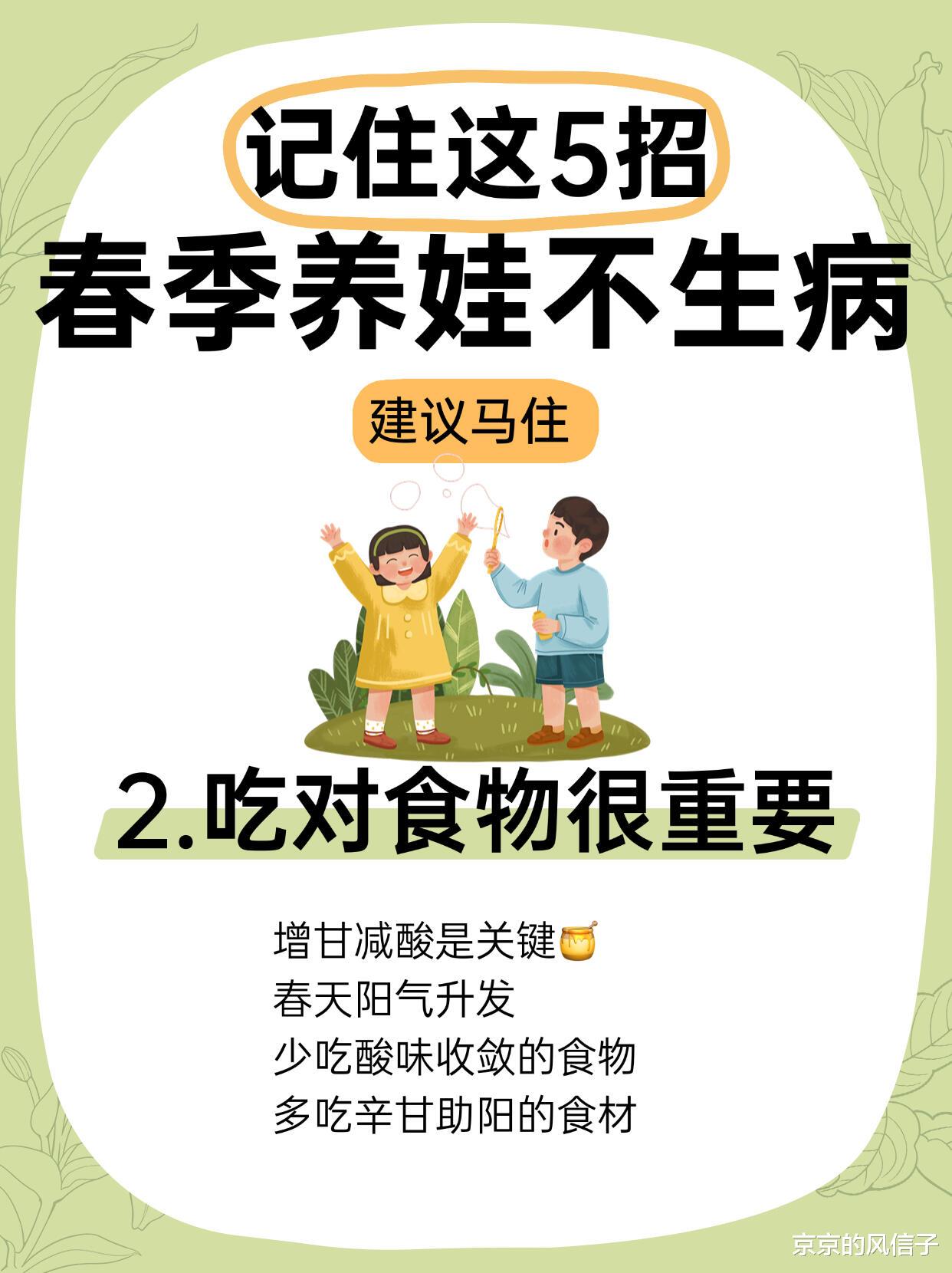 说到饮食,春天阳气升发,适当调整食物的味道对宝宝很有帮助。减少酸味收敛的食物摄入,增加辛甘助阳的食材。这样不仅能增强体质,还能让宝宝活力满满一整天。猪肝、荠菜、茼蒿等都是不错的选择。鲈鱼、佛手、枸杞也都是很好的食材。菊花茶、玫瑰花茶不仅美味还能疏肝祛湿健脾。