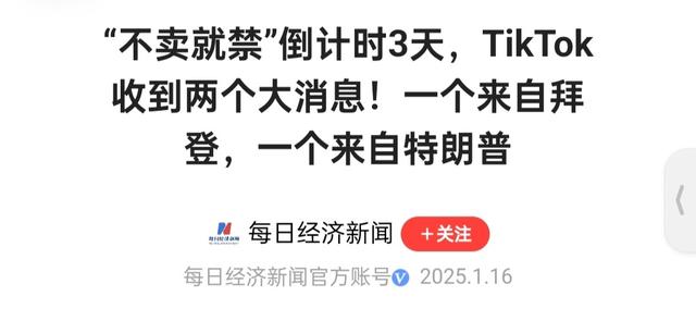 信息来源:每日经济新闻2025年1月16日发布文章《“不卖就禁”倒计时3天,TikTok收到两个大消息!一个来自拜登,一个来自特朗普》