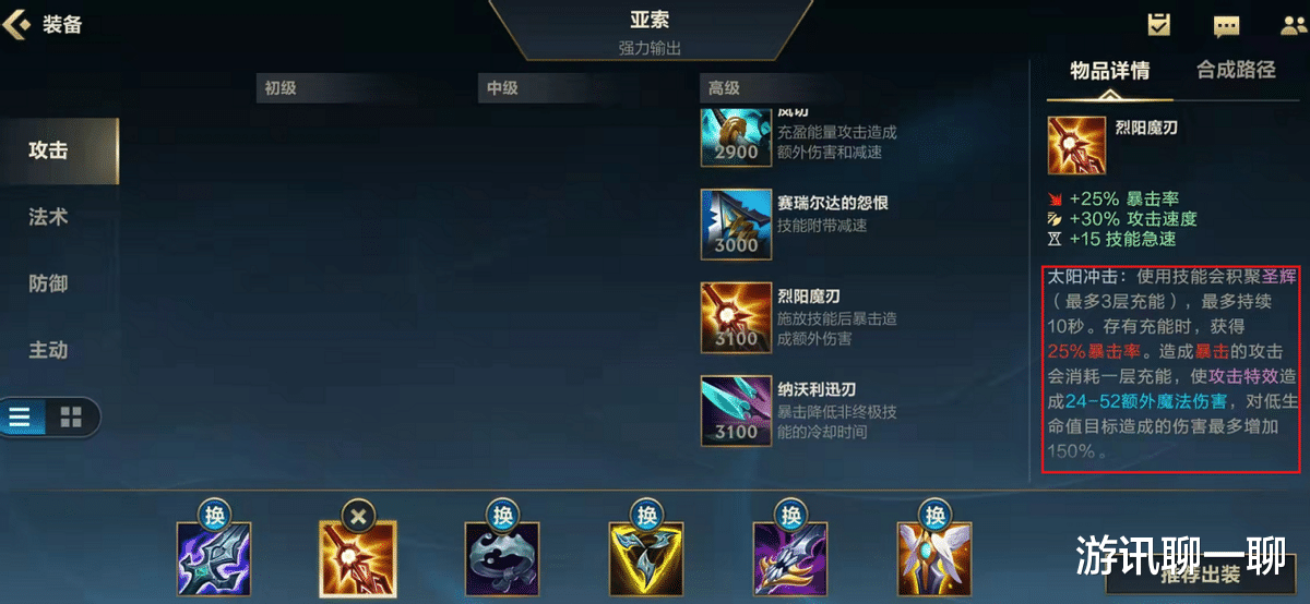 至于另一个装备烈阳魔刃,就更加的简单粗暴了。这个装备是手游才有的,装备拥有25%的暴击率,30%的攻击速度以及15%的技能急速。而且还有一个非常强势的被动技能,使用技能会积攒充能,最多积攒三次,在积攒了充能之后就可以获得25%的暴击率,获得了被动之后,在攻击对手之后还会造成额外的魔法伤害对血量越少的人造成的伤害就越高。看到这件装备,你会想起谁?毫无疑问,大家都跟笔者一样,会想起亚索。因为只要这一件装备,亚索就可以获得100%的暴击,只要使用3技能穿插两次再+一个一技能就能获得百分百暴击。