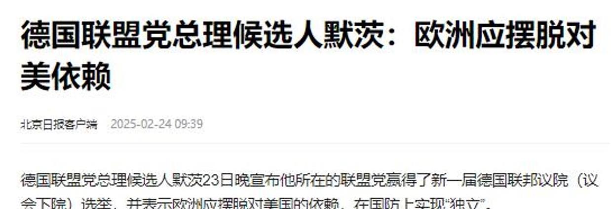 俄乌冲突快满三周年了,最近美俄高官在沙特开了首轮会谈,这事儿让欧洲国家挺紧张的。为了在谈判桌上更有话语权,欧盟决定孤注一掷。也就是前几天,德国基民盟的领导人梅尔茨刚带领党派赢得了联邦议院的选举。在胜选演讲中,他扔出了一个“重磅炸弹”:“面对对我们欧洲命运漠不关心的美国,我们必须建立独立的欧洲防务系统,逐渐摆脱对美国的依赖。”大家要知道,德国一直以来都是跨大西洋联盟最坚定的支持者之一。梅尔茨的这番话意味着什么?欧洲是不是真的要和美国分道扬镳了?这个情况真是让人有点摸不着头脑啊。