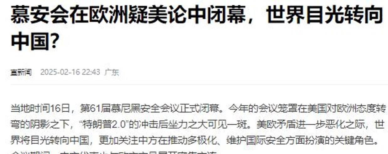 看看这对老夫老妻“闹离婚”的戏码,真是热闹非凡啊。这事还得从慕尼黑安全会议说起。2月14号,美国副总统万斯站在讲台上,硬是把这个安全会议搞成了“吐槽大会”。这位平时就不怎么给欧洲人好脸色的副总统,这次更是火力全开。他一开口就说:“你们欧洲人现在完全背离了民主价值观!” 还不等欧洲人反应过来,他又补了一句:“看看你们现在这样子,极右翼势力都冒出来了,这不是自作自受吗?”这话一出,欧洲那边肯定不高兴了,真是火上浇油啊。