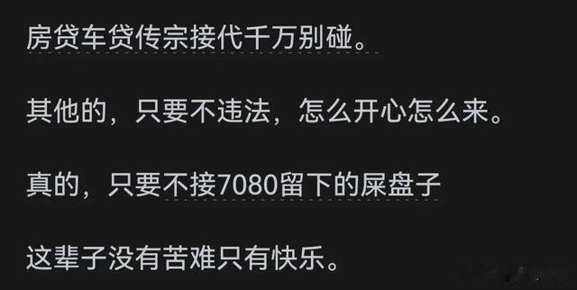 没有房贷,没有商贷,没有下一代,就我最自在。虽然我各人支持这种破坏性不合作的态度,但是也不得不提醒你们一句,按照这里的社会环境和种族性质,你们的人生想只有快乐?,做梦去吧,那是绝对不可能的事情,不接手屎盆子是对的,但不等于就能理所当然的获得快乐,苦难,是跑不掉的,哪一代人都一样。