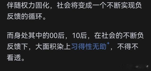习得性无助是最要命的,容易引发群体性抑郁。意思社会发展巅峰已过,正处在一个下降态势。阶级固化,大部分人看不到希望。