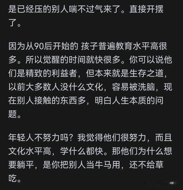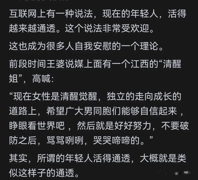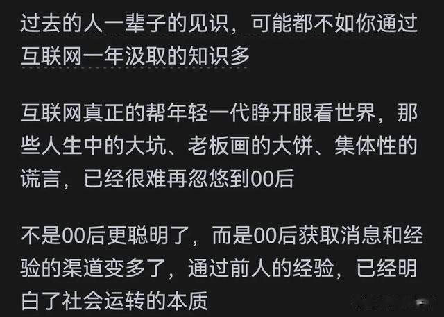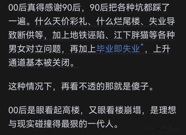 看透不一定是看透社会,可能看透的只是自己剧烈的需求。其实是因为00后没有老一辈那种吃苦耐劳的精神了, 现在世界视野更开阔 ,知道了努力和那些天生出生在罗马的人的巨大差距 。毕竟爸妈那一代过得苦习惯了吃苦 是,我们长在一个相对温饱满足的时代, 吃不了苦又没有机遇, 摆烂地活 和日本社会有点相似。