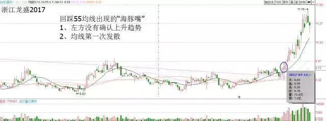具体到34均线出现海豚嘴还是到55均线出现海豚嘴,这是有前期的趋势决定的,如果前期是一波下跌趋势,则可能回调55均线左右,因为回调55均线是二浪的回调。