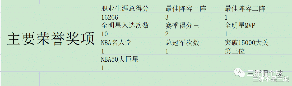 个人荣誉:★★★(三颗星)团队荣誉:★★☆(二星半)个人影响力:★★★★(四颗星)个人实力:★★★☆(三星半)篮球天赋:★★☆(两星半)好啦,今天的闲侃到这里就要结束啦!!如果您喜欢三胖的闲侃就麻烦您点一点免费的赞和关注!!三胖就先谢过各位球友啦!!您的支持对于三胖来说都是莫大的鼓励,有什么想说的想喷的咱们评论区见!!