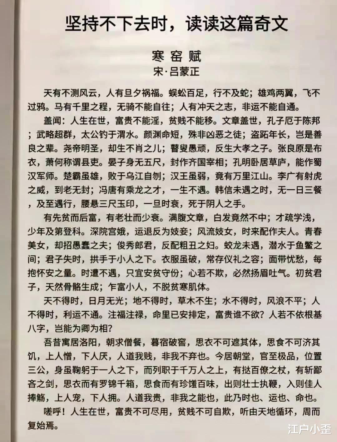 这篇文字叫作《寒窑赋》,我略略一看,感觉文笔比较浅陋,作者却署名宋代吕蒙正。