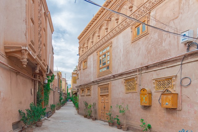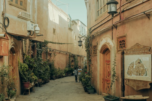 走进喀什古城,就仿佛踏入了中亚的神秘世界。曲径通幽的纵横街巷,犹如迷宫一般,每一个转角都可能隐藏着惊喜。层叠错落的古朴民居,用泥土和岁月堆砌而成,承载着无数的故事与记忆。而那充满浪漫风情的街景,无论是街边盛开的不知名小花,还是墙壁上精美的伊斯兰风格图案,都在无声地诉说着古城的独特气质,将人的心紧紧吸引。