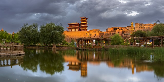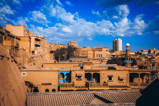 高台民居,作为世界上现存规模最大的生土建筑群,有着独一无二的魅力。泥土房子、跨街楼相互交错,构成了一幅奇特而又和谐的画面。穿梭在迷宫般的小巷中,就像是在进行一场冒险。你会发现,这里隐藏着无数的民族风情。也许在某个转角处,会遇到一位正在制作传统手工艺品的老人,他专注的神情和精湛的技艺会让你驻足观看;也许会听到从某户人家中传出悠扬的维吾尔族音乐,那美妙的旋律仿佛在诉说着古城的故事。