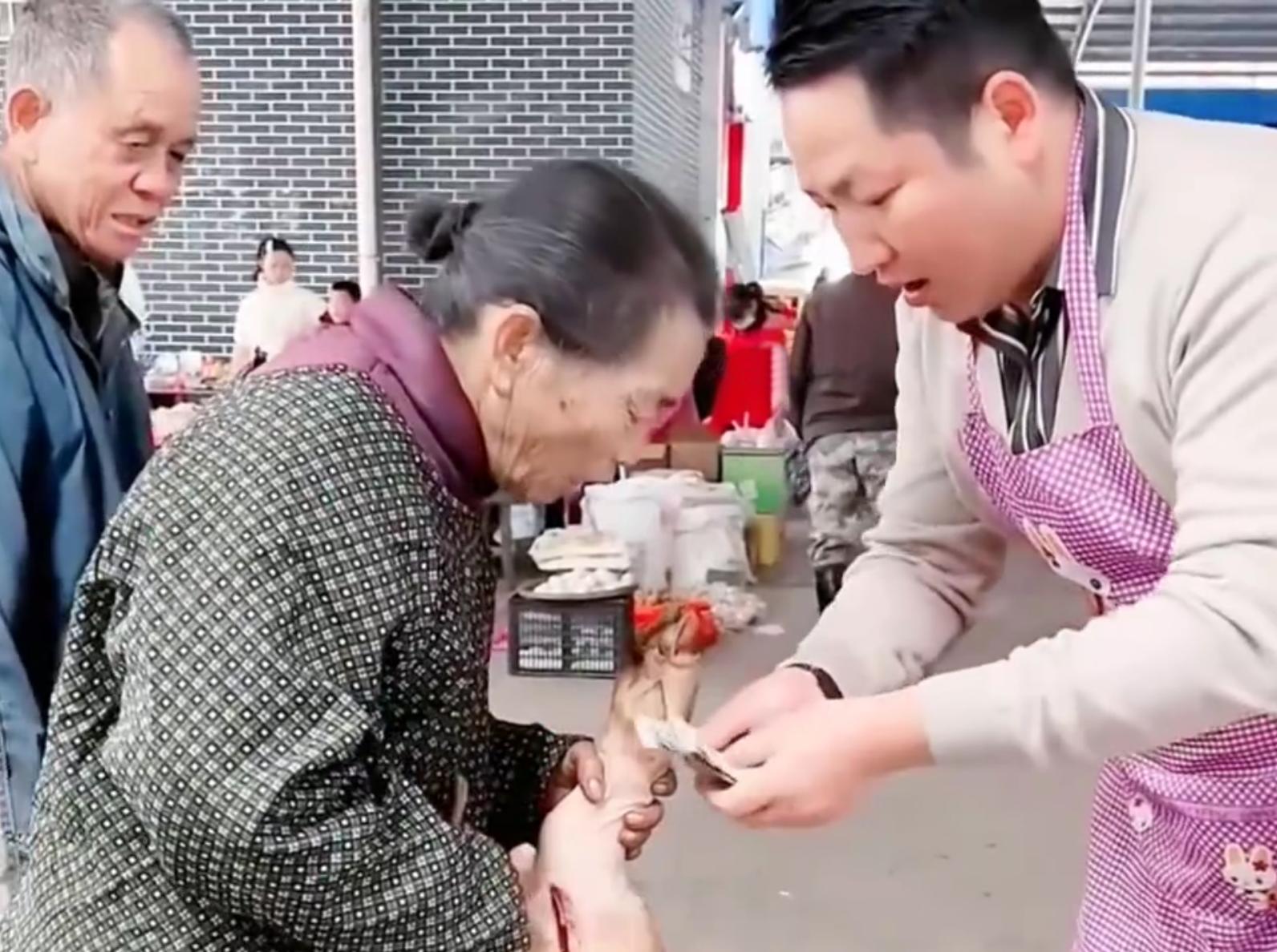 这对老夫妻感动得热泪盈眶,一个劲冲卖肉的老板作揖致谢,称赞他人好心善。