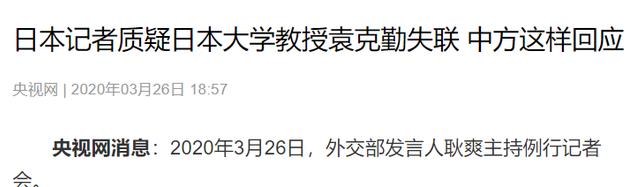 信源:央视网2020-03-26《日本大学教授袁克勤涉间谍犯罪被依法审查中方这样回应》