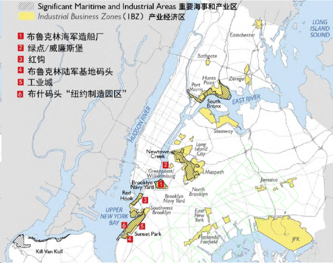 下图:纽约的产业经济区(IBZ)和重要制造产业园区分布图(图片来源:SIITD课题组)