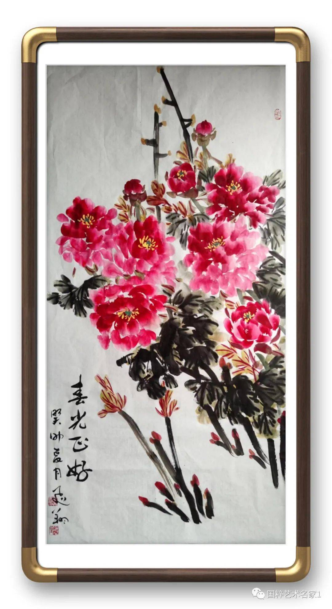 先生善画牡丹、藤蔓。笔下牡丹层次丰富有立体感,形神兼备,韵味无穷。表现出的牡丹雍容而不失恬静;富贵又不失典雅。所画凌霄、紫藤以草书写意,笔走龙蛇,疾风骤雨,柳暗花明……我很欣赏他作画的情绪,一天到晚,精神饱满,全心沉浸在书画创造的世界中。