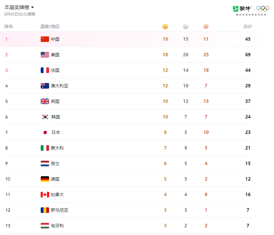 而在总奖牌榜上,中国代表团以19金15银11铜继续位列金牌榜第一名。美国队反超澳大利亚、法国队重返第二18金26银25铜。