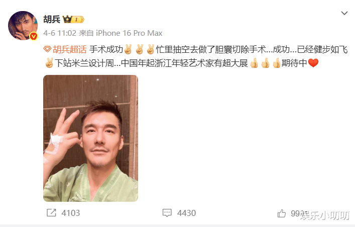 近日,54岁的胡兵因为胆囊切除手术住院,4月6日本人在社交平台官宣了自己手术成功的消息,4月8日办理出院后就按照行程开启了米兰设计周之旅。其实这一举动还是引发不小的热议,刚刚手术完就投入工作,虽然胡兵的晒照看起来状态都非常好,但4月6日的晒照手上打点滴的滞留针都还在。