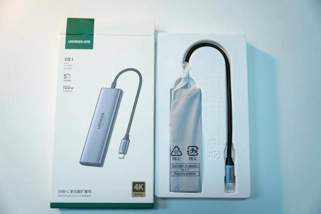 绿联的包装很细心,塑料开模卡盒可以牢牢固定住整个扩展坞,主体有PE-C塑料袋包裹防止划伤,C口接入端也有小塑料套进行防护。15公分长度的线材采用编织绳包裹加固,提升了对于数据传输的稳定和耐用性,在使用中就算线材扭曲也不用担心传输有误。