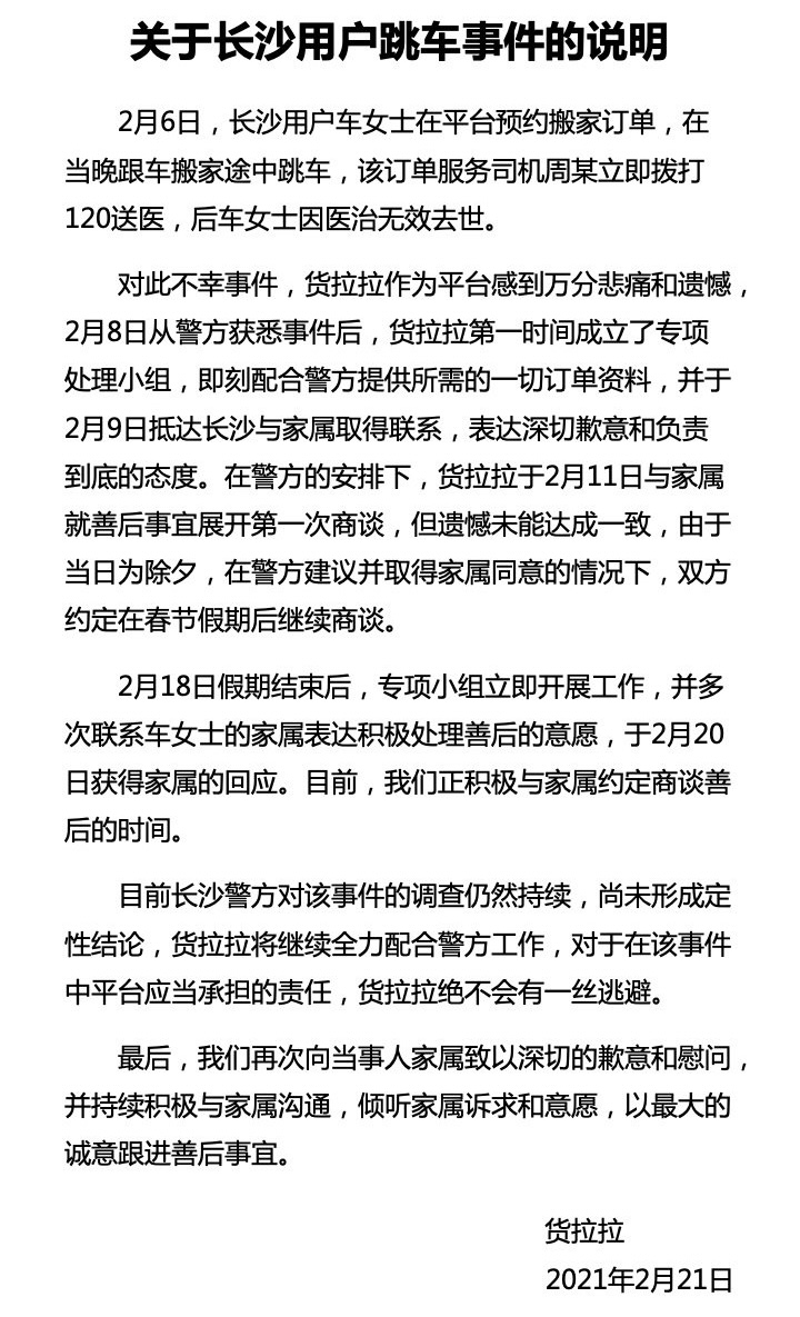 2021年2月6日晚9点,湖南长沙23岁的车女士从货拉拉副驾驶跳窗,后经抢救无效不幸离世。有网友梳理了时间线。