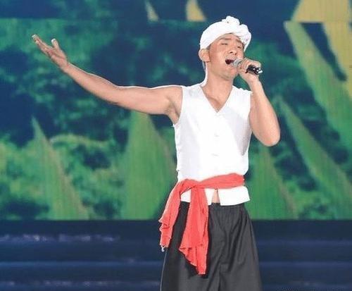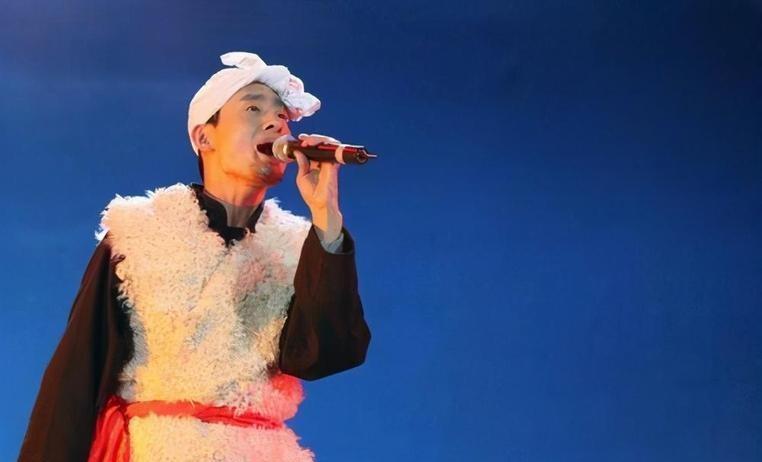 当时的阿宝头扎着白毛巾,腰上捆着红腰带,穿着羊羔毛衣服就来到了舞台上。