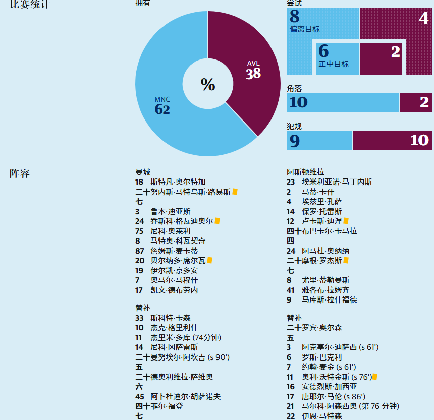 拉什福德右路带球进入禁区的几次尝试也未能转化为进球,他的射门偏出。补时阶段,马尔穆什虽然将球送入球门,但因越位在先被判无效。最终,努涅斯的那粒补时进球成了整场比赛的分水岭。