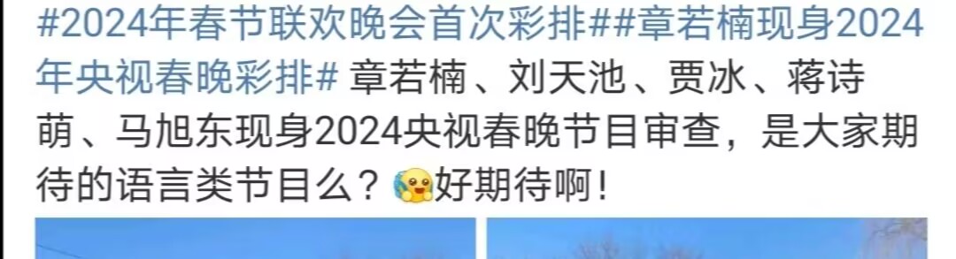 2024年春晚进入首次彩排阶段,从网上目前透露出来的照片可知,参与首次彩排的部分艺人有章若楠、刘天池、贾冰、蒋诗萌、马旭东,应该表演的是语言类节目。
