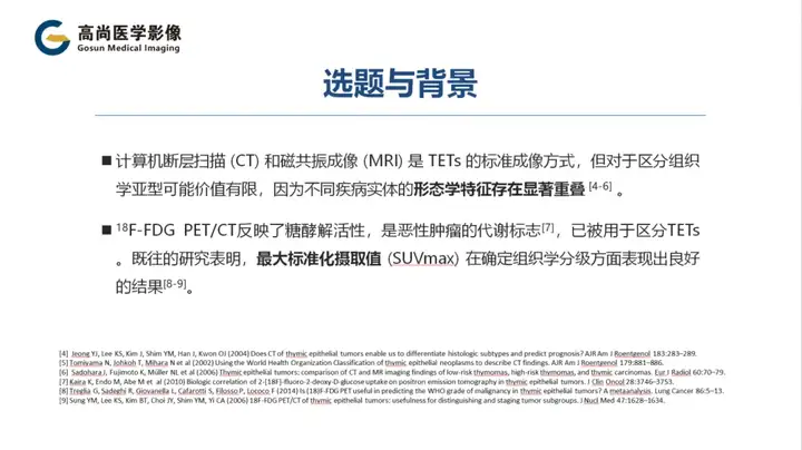 目前,计算机断层扫描(CT)和磁共振成像(MRI)是人类胸腺上皮肿瘤 TETS 的标准成像方式,但对于区分组织学亚型可能价值有限,因为不同疾病实体的形态学特征存在显著重叠。18F-FDG PET/CT反映了糖酵解活性,是恶性肿瘤的代谢标志,已被用于区分TETs。既往的研究表明,最大标准化摄取值(SUVmax)在确定组织学分级方面表现出良好的结果。