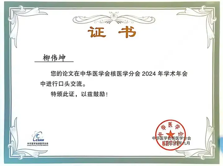 2024年9月12—15日,高尚健康集团广州中心副院长柳伟坤受邀出席中华医学会核医学分会2024年学术年会。这是一场专属于中国核医学界的学术盛宴,代表业界前沿的学术水平。柳伟坤副院长所著的论文《18F-FDG PET/CT 在胸腺上皮肿瘤的临床应用价值》被中华医学会核医学分会2024年学术年会收录,中心主治医师彭李所著论文入选壁报交流。大会上,柳副院长进行该论文的口头交流汇报,并获得中华医学会核医学分会2024年学术年会颁发证书。这次受邀出席并获得证书,代表着高尚健康集团广州中心在学术造诣上不断勇攀高峰,精益求精,以更高水平的学术成就,为国家医疗健康事业发展再立新功。