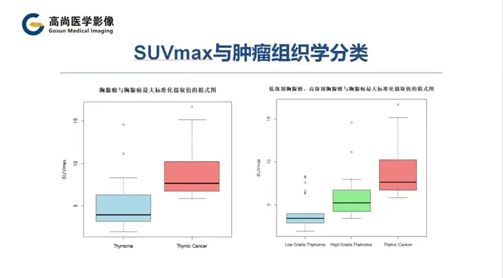 根据新的TNM分期系统,胸腺上皮肿瘤的患者在Ⅲ和IV期的SUVmax明显高于I和Ⅱ期的患者,SUVmax与T分期相关,并且可能有助于预测胸腺上皮肿瘤的T分期。