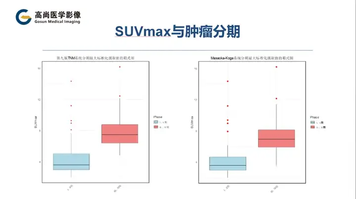 根据Masaoka-Koga分期和第9版TNM分期,两种分期方法中III期和IV期患者的SUVmax均显著高于I期和II期患者(p<0.01)。